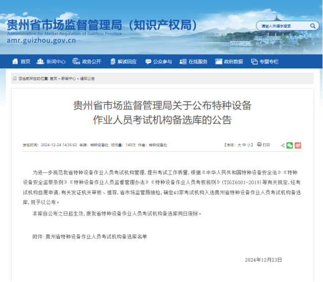 2024年12月23日,贵州省市场监督管理局公布了经过重新严格筛选评审后的全省设备作业人员考试机构名单,贵阳黔贵交通职业培训学校黔西南州考核点成功入选,这是贵州公路集团旗下企业取得的第二家特种设备作业人员考试机构资格。