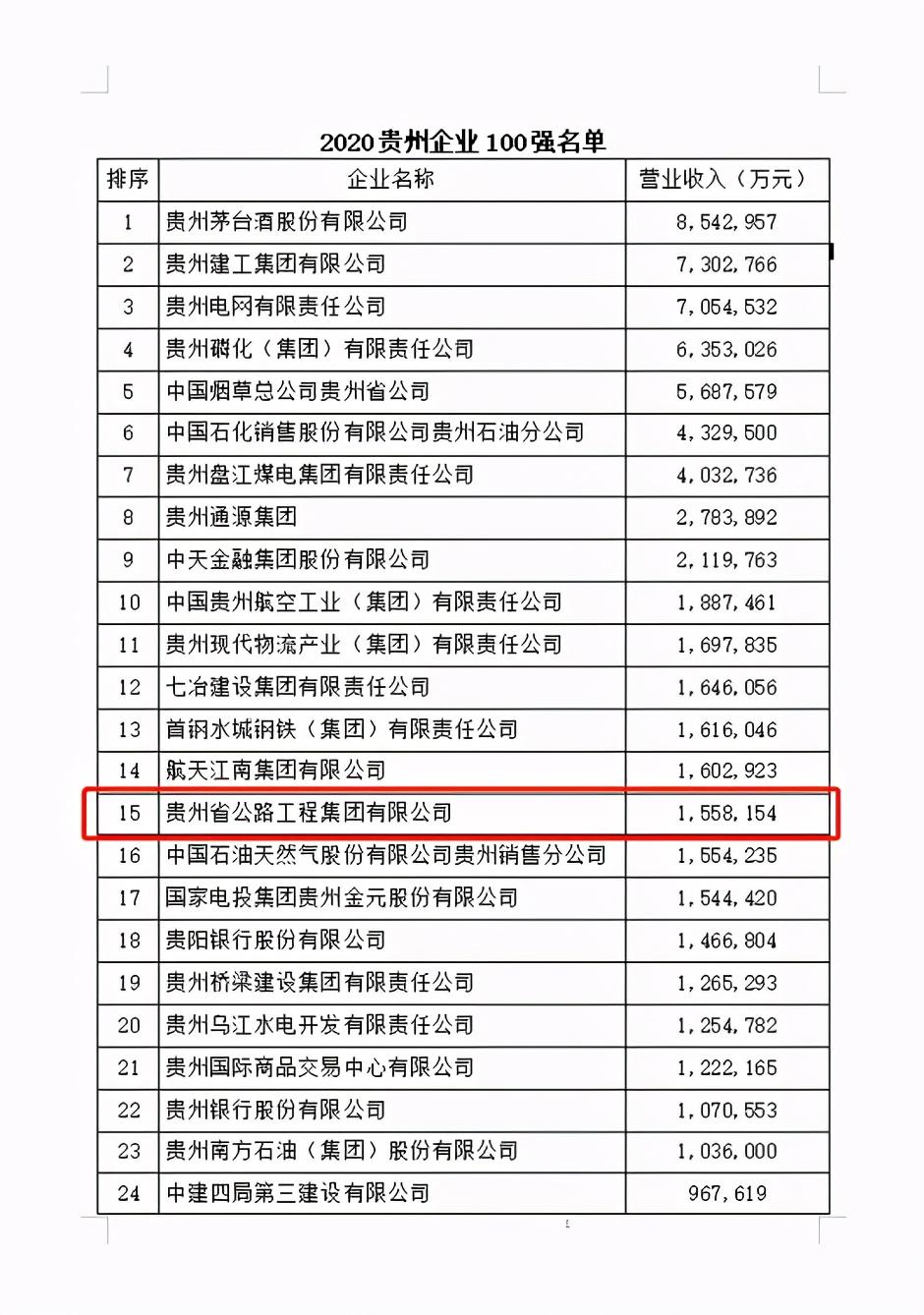 10月26日,贵州省企业联合会、省企业家协会在贵州大学明德学院发布了2020贵州企业100强榜单,贵州公路集团凭借155.8亿元的营业收入和在纳税、就业人数、市场拓展等方面的突出表现,位列贵州省企业第15位,位居全省交通施工行业首位,这也是公路集团连续10年入选贵州百强企业。